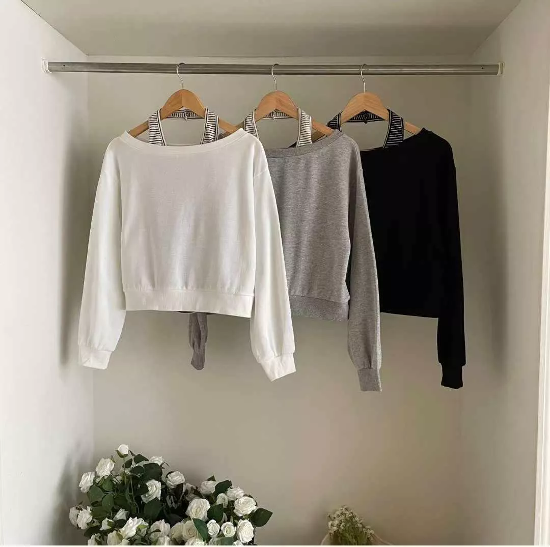 韓系微性感兩件式設計,斜肩上衣搭配條紋內背心,隨性中帶點氣質,慵懶又時髦。